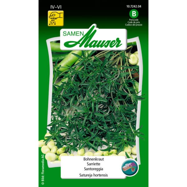Einjähriges, wüchsiges Bohnenkraut, Höhe ca. 3 cm. Passt besonders gut zu gekochten Bohnen mit Speck, aber auch zum Würzen von Gemüse und Suppen.