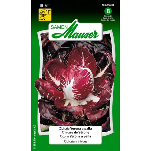 Aussaat: März – Juni als Schnittzichorie, Juli – August für die Ernte als Rosettenzichorie für Frühlingsernte; in Reihen von 2 cm säen und 2 cm mit Erde decken.